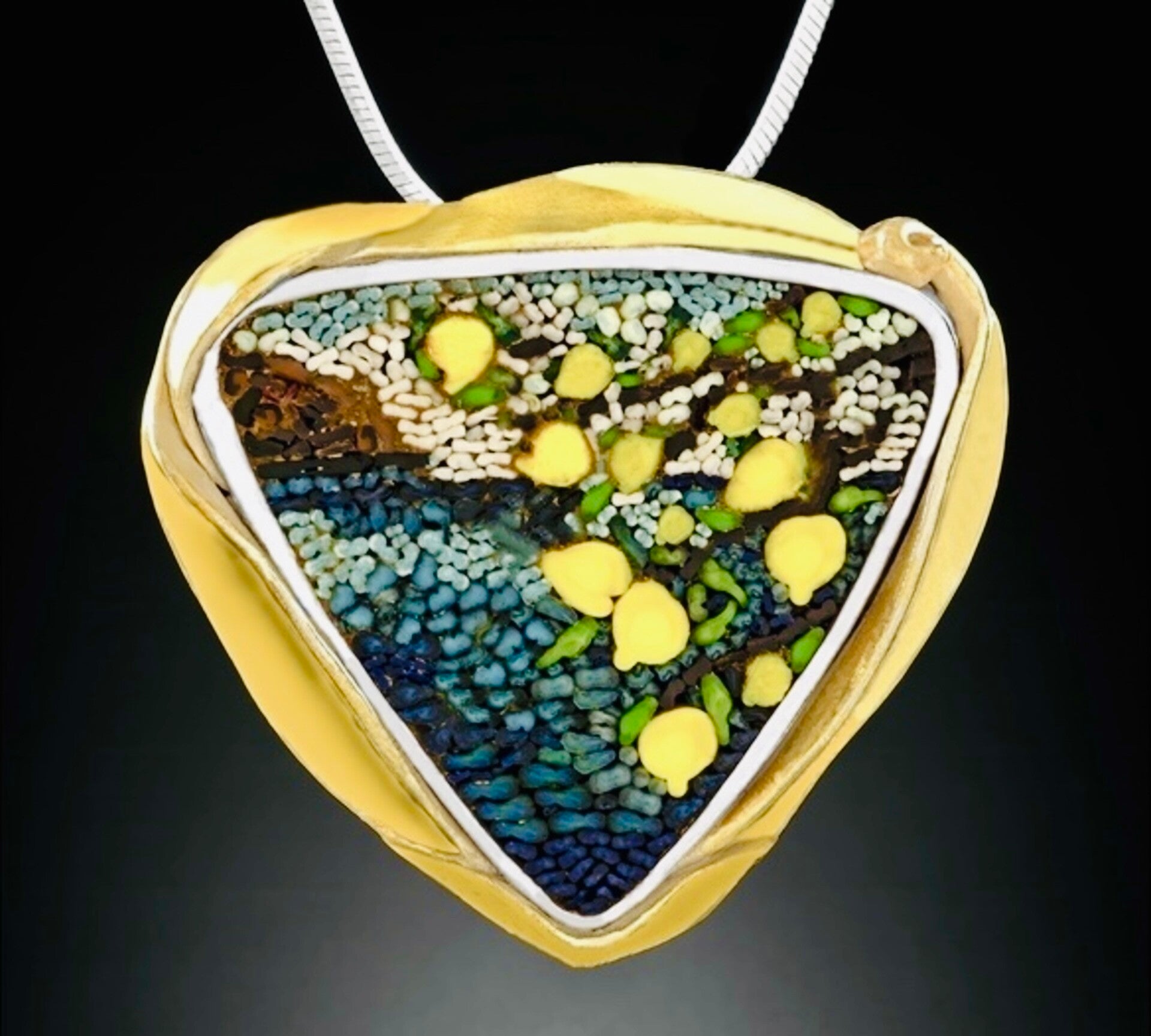Inspired by the iconic lemon trees of Italy, this micro mosaic is made with thin threads of glass and set into a 99.9% pure silver setting with 24k gold accents. O